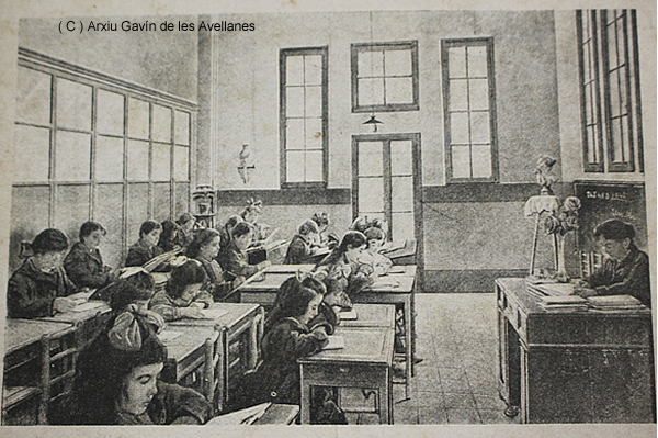 Sota el dibuix de la classe de nenes amb la seva mestra hi ha el text: "Una de las clases de la sección especial para señoritas". Podeu observar la part del darrere de la postal, datada i signada el mes d'agost del 1.918. A la part inferior dreta el segell de 10 cèntims d'Alfons XIII.
