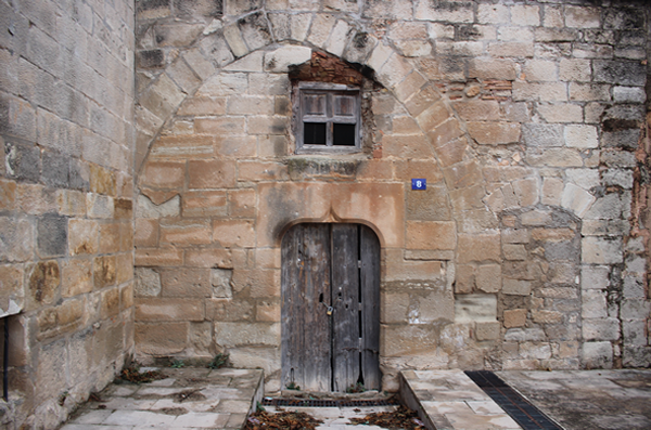 Si ens fixem en l'altra façana de la plaça, la que està a l'esquerra de la porta d'accés, veureu que hi ha quatre portalades, tres tapiades i una amb els batents de fusta en molt bon estat. D'esquerra a dreta trobem les portes: d'arc rebaixat, d' arc de mig punt, de llinda plana amb el vell bastiment de fusta i d'arc carpanell.
