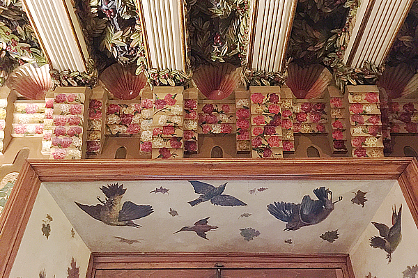 Als brancals que separen el menjador de la tribuna hi podem veure pintures amb motius de flora i fauna ( pardals, colibrís, flamencs, garses, grues ). Entre les bigues del sostre hi ha decoració amb fruites i fulles d'arboç.